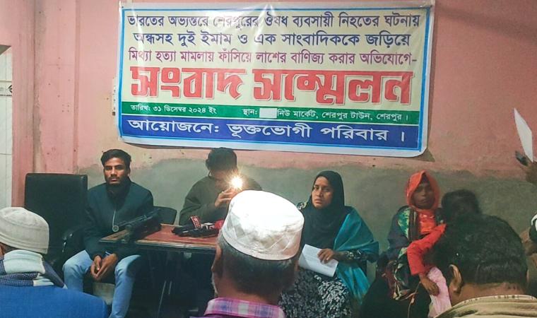 ভারতের ভূখন্ডে শেরপুর জেলার সদর উপজেলার কামারিয়া ইউনিয়নের পূর্ব আলিনাপাড়া গ্রামের ঔষধ ব্যবসায়ী মোঃ রেজাউল করিম নিহতের ঘটনায় ঢাকা বিশ্ববিদ্যালয়ে অধ্যয়নরত অন্ধ শিক্ষার্থী মোঃ ফজলুল হক, দুই ইমাম ও সাংবাদিক মারুফুর রহমানকে জড়িয়ে মিথ্যা হত্যা মামলায় ফাঁসিয়ে অর্থ বাণিজ্যর প্রতিবাদে ভুক্তভোগী পরিবারের সদস্যরা ৩১ ডিসেম্বর মঙ্গলবার বিকেল ৪টায় শেরপুর শহরের নিউমার্কেট দৈনিক তথ্যধারা মিলনায়তনে এক সংবাদ সম্মেলন করেছেন।