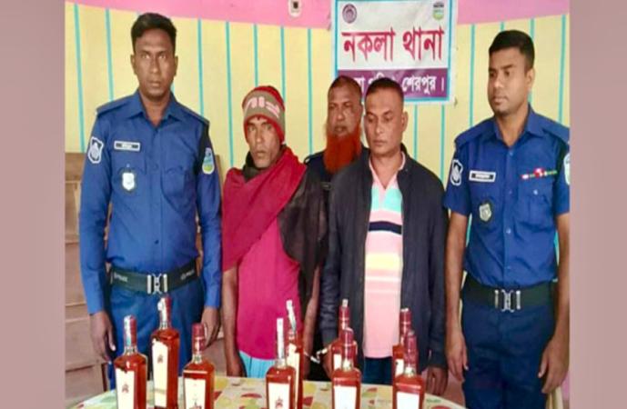 নকলা থানা সূত্র জানায়, ধনাকোষা পুরাতন বাজার এলাকায় সন্দেহজনক একটি মোটরসাইকেল থামিয়ে তল্লাশি চালানো হলে চালক নুরুজ্জামান ও আরোহী হানিফের কাছ থেকে একটি ব্যাগে রাখা ৯ বোতল ‘রয়েল স্টেক ডিলাক্স’ ব্র্যান্ডের ভারতীয় হুইস্কি উদ্ধার করা হয়। প্রতিটি বোতলের পরিমাণ ৭৫০ গ্রাম। উদ্ধার করা মদের বাজারমূল্য প্রায় ৪৫ হাজার টাকা।