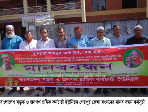 বাংলাদেশ সড়ক ও জনপথ শ্রমিক কর্মচারী ইউনিয়ন (জাতীয় শ্রমিকলীগ অর্ন্তভূক্ত) সংগঠনের কেন্দ্রিয় কর্মসূচীর অংশ হিসেবে শেরপুর জেলা সংসদ মানব বন্ধন কর্মসূচী পালনে জেলার সকল শ্রমিক ও কর্মচারী অংশ গ্রহণ করেন। এসময় নেতৃবৃন্দ বলেন, জনপ্রশাসন মন্ত্রণালয় কর্তৃক যাচাই বাচাইকৃত ২৬৬৭ জন ওয়ার্কচার্জড কর্মচারীদেরকে দ্রুততম সময়ে মধ্যে শুন্য পদের বরাবরে নিয়মিত ও অবশিষ্ট ৪৩৯২ জন ওয়ার্কচার্জড শর্ত শিথিল পূর্বক পূর্বের ন্যায় কনভার্টেড রেগুলার এর আওতায় এনে নিয়মিত করণের প্রজ্ঞাপন/এসআরও জারী করতে হবে। বিভিন্ন শ্রেণি/সড়ক বিভাগে কর্মরত কর্মচারীগণ কর্তৃক মহামান্য হাইকোর্ট/ সুপ্রীম কোর্টে দায়েরকৃত মামলার রায়/ নির্দেশনা দ্রুততম সময়ের মধ্যে বাস্তবায়ন করতে হবে। ওয়ার্কচার্জড কর্মচারীদেরকে নিয়মিত করণের পর মাস্টাররোল কর্মচারীদেরকেও নিয়মিত সংস্থাপনে আনয়ন করতে হবে।
