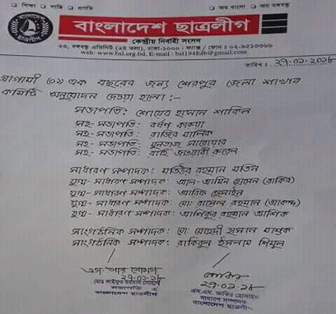 পরবর্তীতে সমন্বয়ের মাধ্যমে পূর্ণাঙ্গ কমিটি গঠনের নির্দেশনা দেওয়া হয়েছে। এদিকে জেলা ছাত্রলীগের নতুন কমিটি ঘোষণা করায় কেন্দ্রীয় ছাত্রলীগের সভাপতি সাইফুর রহমান সোহাগ ও সাধারণ সম্পাদক এসএম জাকির হোসাইনকে অভিনন্দন জানিয়েছেন শেরপুর জেলা আওয়ামী লীগের সভাপতি হুইপ আতিউর রহমান আতিক ও সাধারণ সম্পাদক এডভোকেট চন্দন কুমার পাল পিপি প্রমুখ।