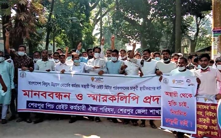 বিদ্যুৎ উন্নয়ন বোর্ডে চাকরি স্থায়ীকরণের দাবিতে শেরপুরে মানববন্ধন