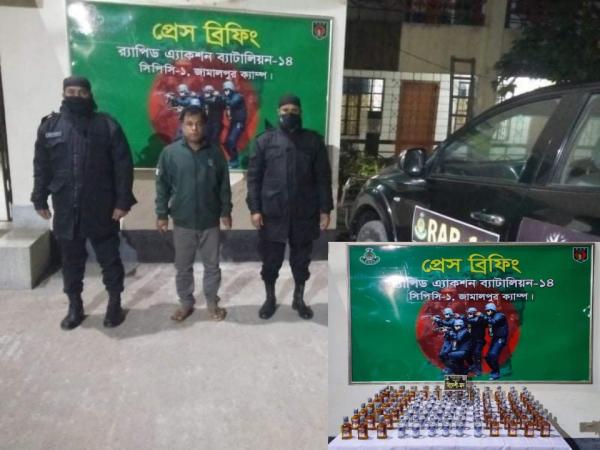 র্যাব-১৪, জামালপুর ক্যাম্পের প্রেস রিলিজ সুত্রে জানা গেছে, গত ৩০ জানুয়ারী রবিবার দিবাগত রাত ৮ ঘটিকার সময় গোপন সংবাদের ভিত্তিতে র্যাব-১৪, সিপিসি-১, জামালপুর ক্যাম্পের কোম্পানী কমান্ডার স্কোয়াড্রন লিডার আশিক উজ্জামান এর নেতৃত্বে র্যাবের একটি আভিযানিক দল শেরপুর জেলার ঝিনাইগাতী থানাধীন ঝিনাইগাতী টু রাংটিয়া মোড় সোনার বাংলা ষ্টোরের সামনে পাঁকা রাস্তার উপর অভিযান পরিচালনা করে ১শত বোতল বিদেশী মদসহ মো. আঃ আজিজকে গ্রেপ্তার করে।