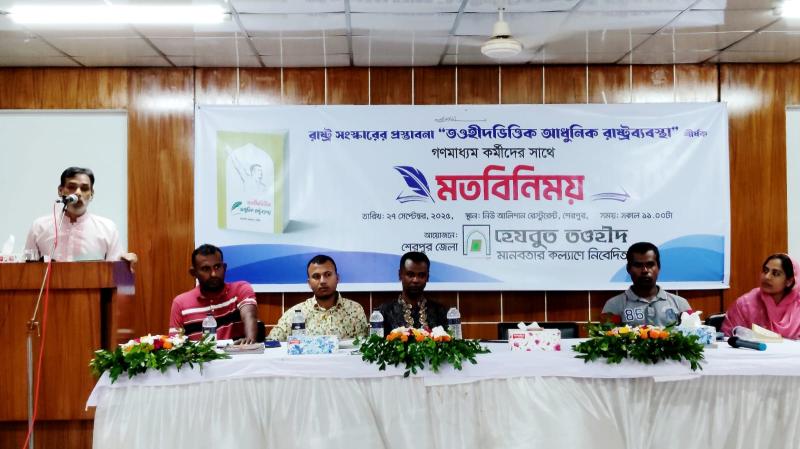 ‘স্রষ্টার জীবনব্যবস্থাই ন্যায়, সাম্য ও সুবিচার প্রতিষ্ঠা করতে পারে’—এই প্রতিপাদ্যকে সামনে রেখে শেরপুরে ‘তওহীদভিত্তিক আধুনিক রাষ্ট্রব্যবস্থা’ শীর্ষক মতবিনিময় সভা অনুষ্ঠিত হয়েছে। শনিবার (২৭ সেপ্টেম্বর) সকাল ১১টায় শহরের নিউমার্কেটে অবস্থিত নিউ আলিশান রেস্টুরেন্টে জেলা হেযবুত তওহীদের আয়োজনে এ সভা হয়।