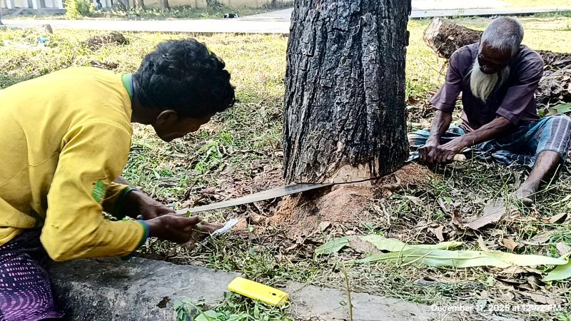 গাছ কাটার কাজে নিয়োজিত শ্রমিকরা জানান, “আমরা প্রিন্সিপালের নির্দেশেই তালিকা অনুযায়ী গাছগুলো কাটছি।”